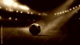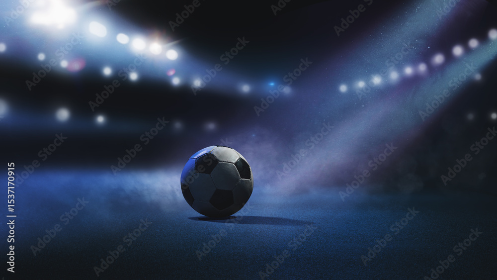 textured soccer game field - center, midfield. spotlight illuminates asphalt, smoke