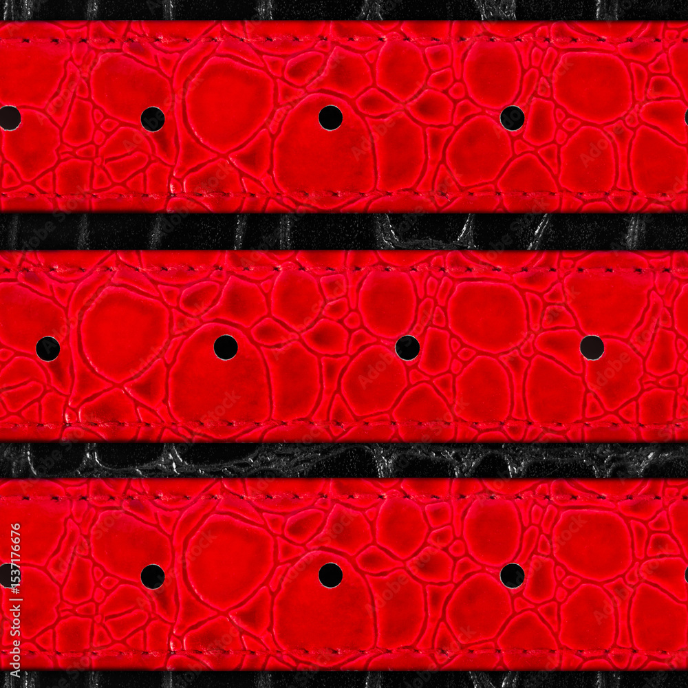 Seamless 4k photo texture material of red colored reptile polished leather surface with stitches on black leather backdrop.