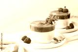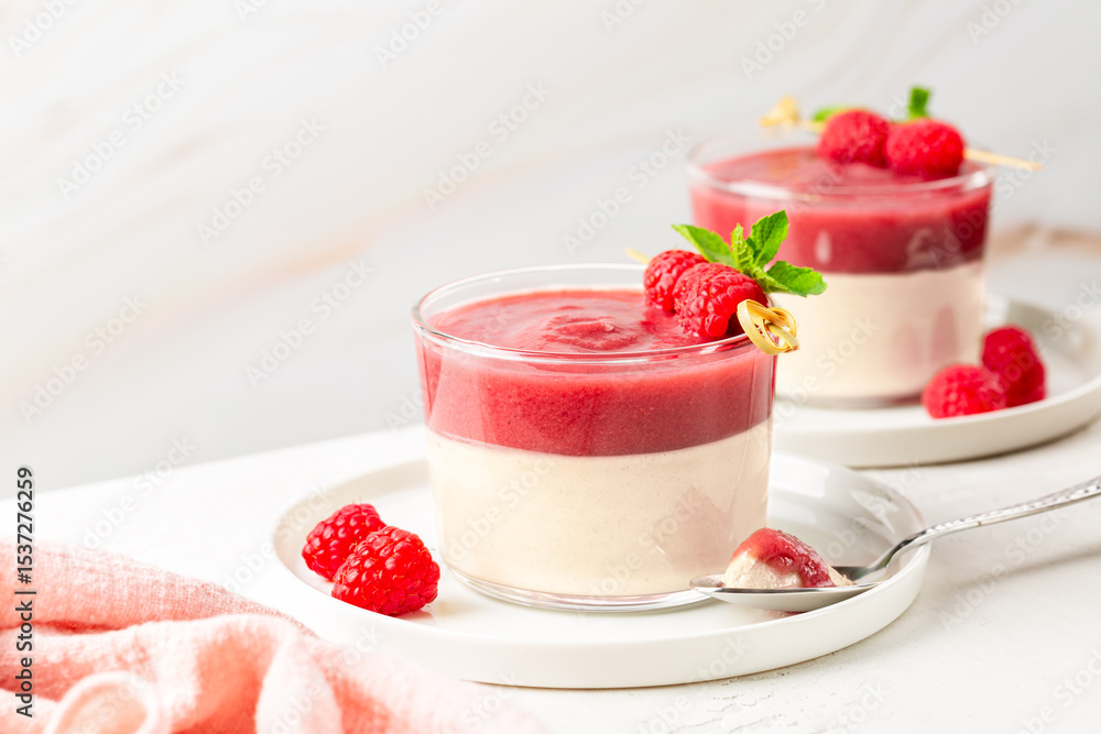 Bavarian cream with raspberry coulis, sauce. Set in glass dessert. Egg-based cooked custard and gelatin with whipped cream.