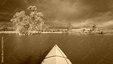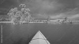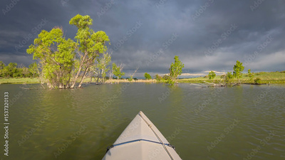 paddling under stormy sky through narrow passage in reeds- POV view from paddling kayak or canoe on Boedecker Reservoir in Loveland, Colorado