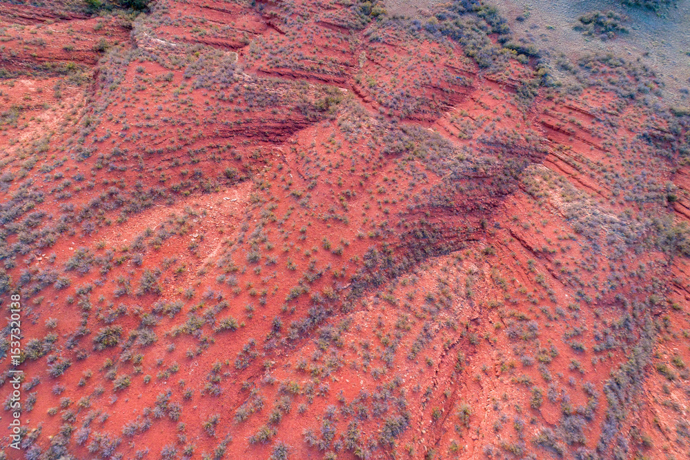 dusk over rugged foothills of Rocky Mountains in northern Colorado with red sandstone and canyons, aerial view