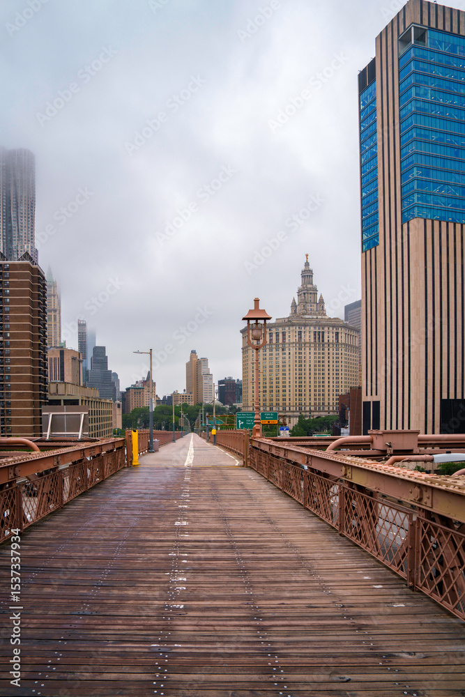 Manhattan skyline and buildings in New York City, viewed from the Brooklyn Bridge on a foggy rainy summer morning in USA