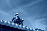 Construction Roofer in Yellow Hard Hat Working on House Roof Edge Against Blue Sky