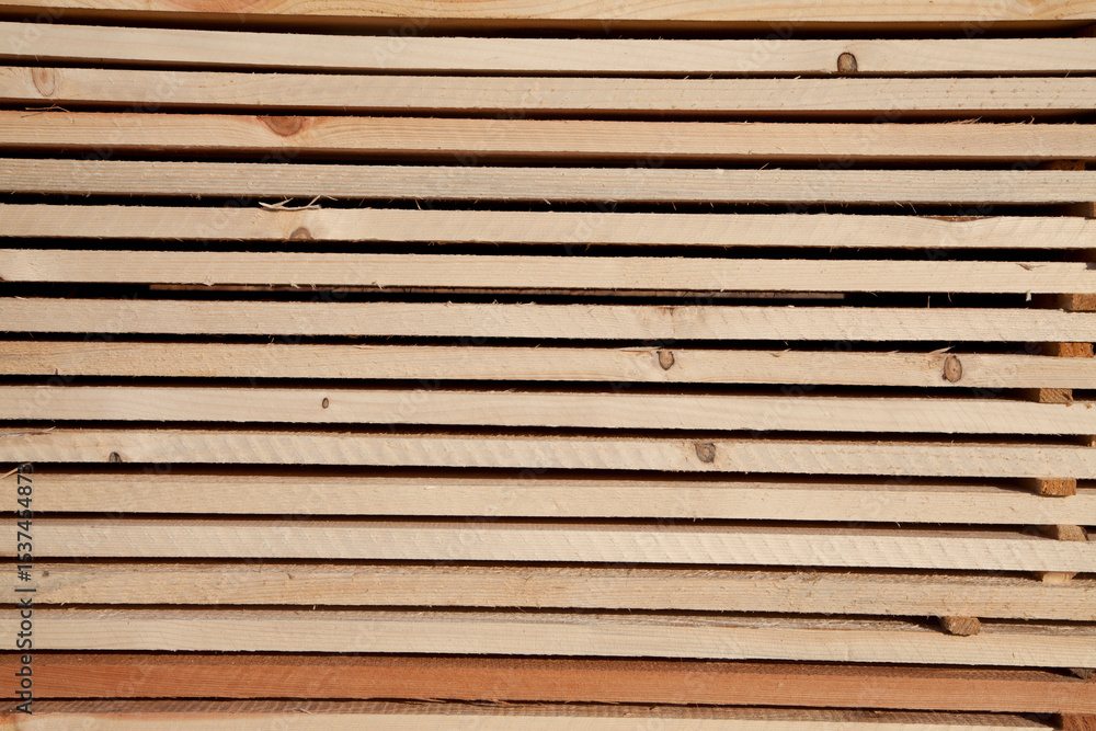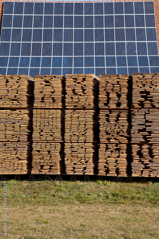 Zum Trocknen gestapelte Bretter vor einer Solaranlage auf dem Dach im Sägewerk - Holzindustrie 4.0