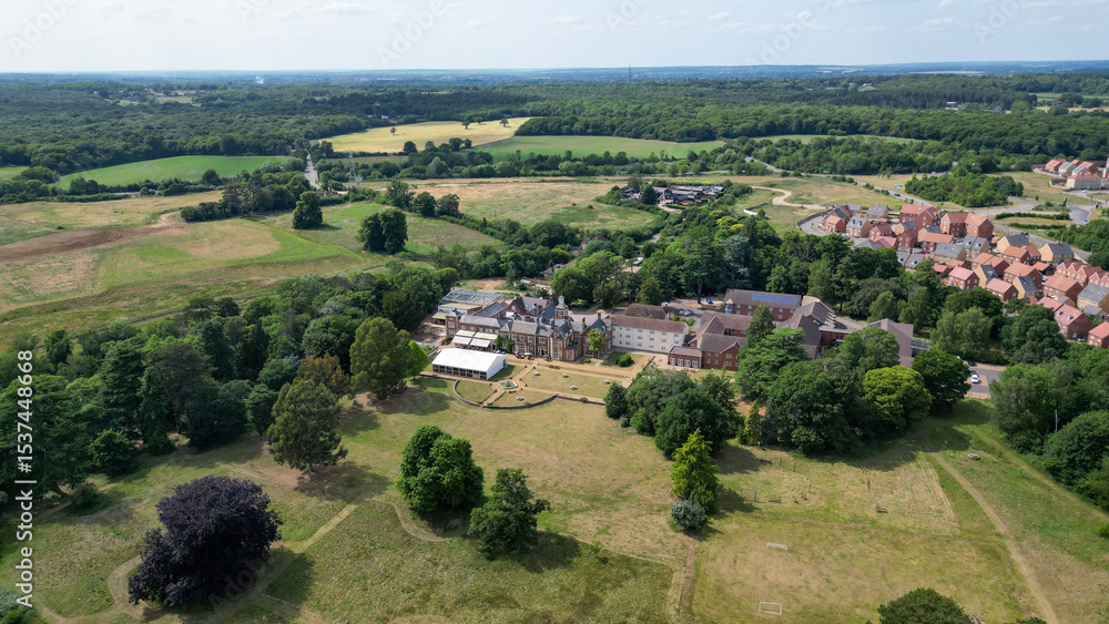 Aerial view of park and woodland showing fields, housing estates and nature