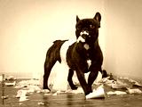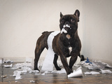 Funny dog made a mess in the room. Playful puppy French bulldog
