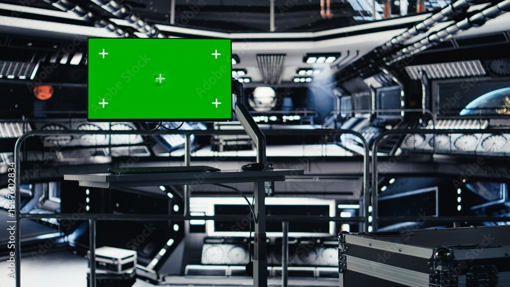 Chroma key monitor assisting orbit station astronauts in performing routine maintenance. Isolated screen display in spaceship used for performing routine maintenance and doing mission analysis