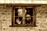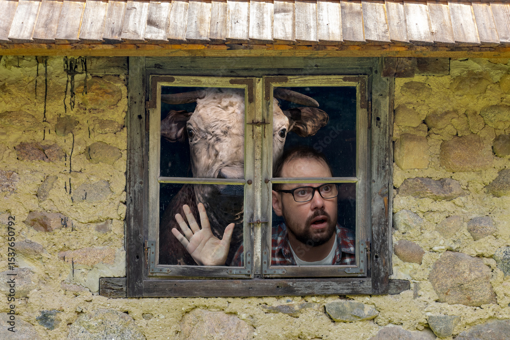 Shocked man looking out of the window of an old farm with a cow behind his back