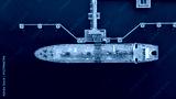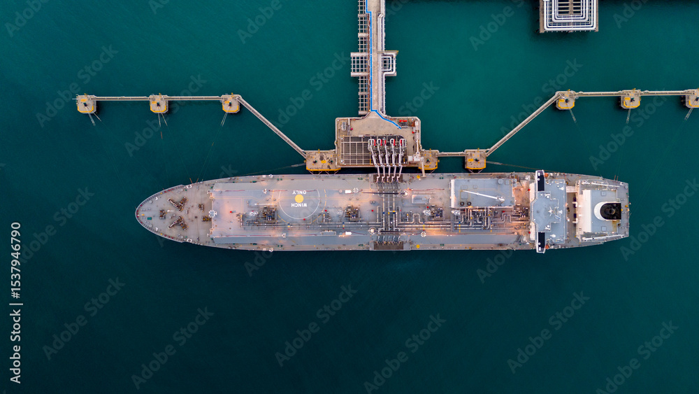 Aerial view of an LNG tanker docked at an offshore terminal with multiple pipelines, storage tanks, and an industrial complex. Captures global energy logistics