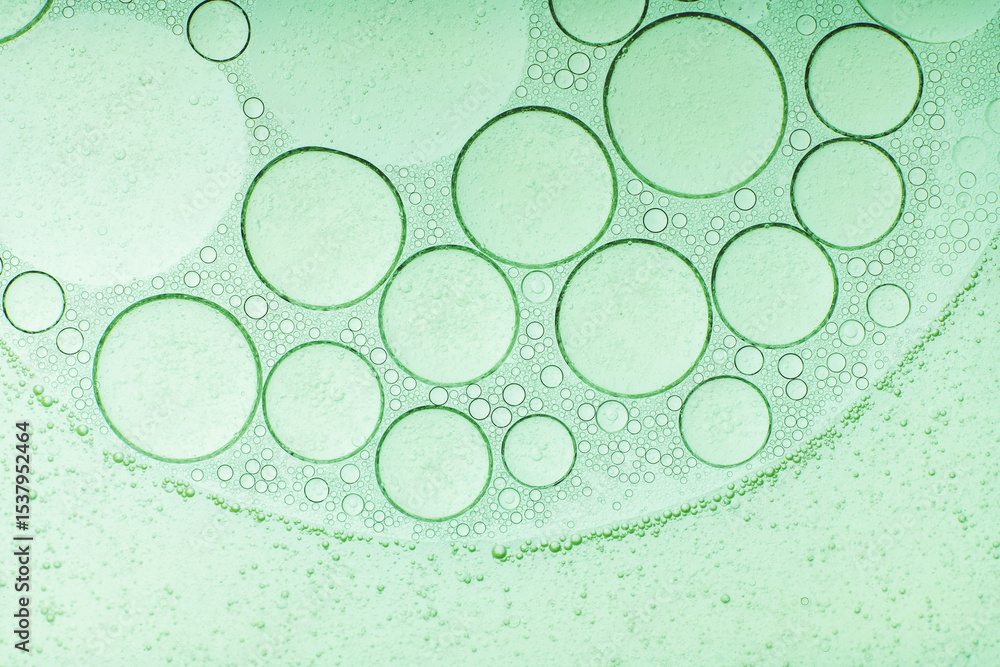 Macro microscope green bubble texture, Close-up Green bubbles and drops oil background . blue green water bubbles, close up golden oil drop for cosmetic