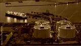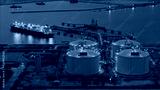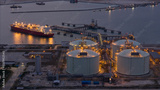 Aerial view of an LNG tanker docked at an offshore terminal with multiple pipelines, storage tanks, and an industrial complex. Captures global energy logistics