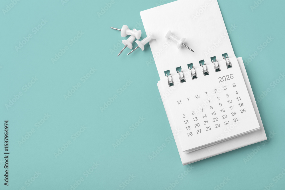 Calendar 2026 with pin on pastel green background, business schedule, planner, reminder concept, top view