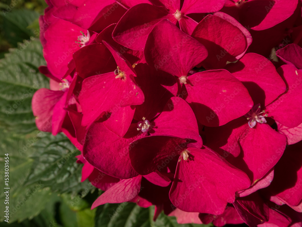 Deep Red Hydrangea Macrophylla Merveille Sanguine Blossoms with Green Leaves