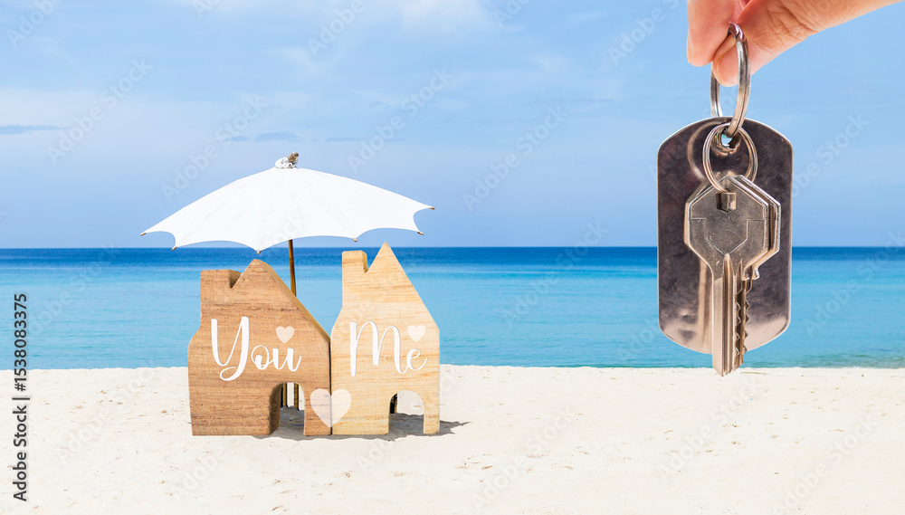 You and me on wooden house model with house key in girl hand over tropical beach background, wedding gift, property and real estate business