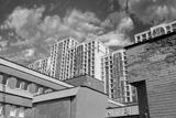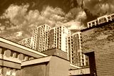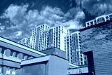 Cityscape on a summer day, modern buildings and houses against the blue sky