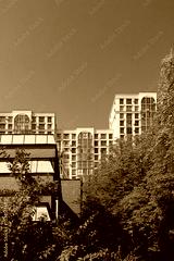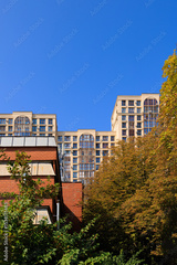 City view on a sunny day. Modern building and houses against the blue sky.