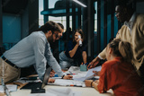 A diverse group of business people collaboratively brainstorm and discuss project ideas, fostering innovation and teamwork. The multiracial and multigenerational team is focused on creativity and
