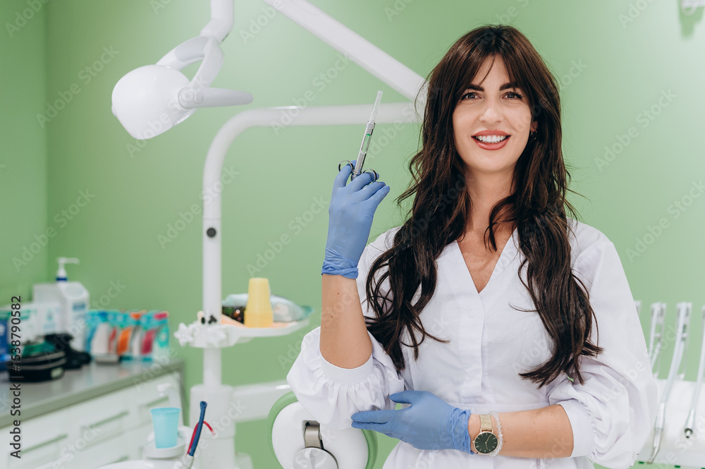 Portrait of a young female dentist in uniform at a modern dental clinic, smiling confidently