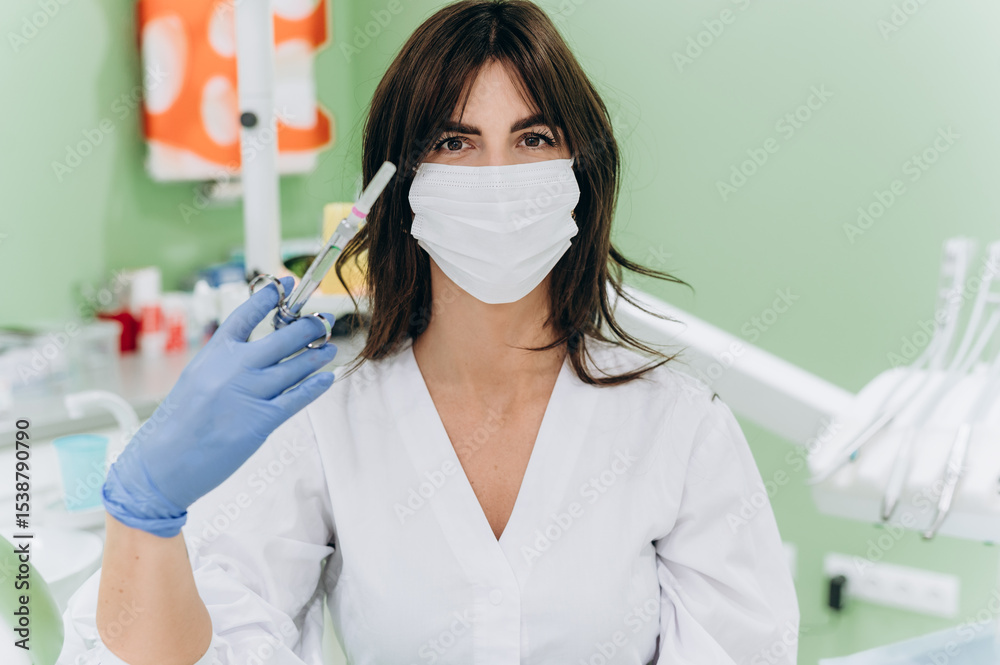 Portrait of a young female dentist wearing mask and holding syringe in modern clinic setting