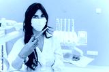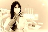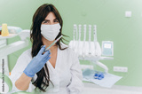 Portrait of a young female dentist wearing mask and holding syringe in modern clinic setting