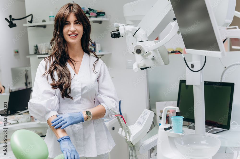 Portrait of a young female dentist in uniform at a modern dental clinic, smiling confidently.
