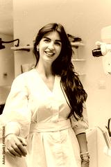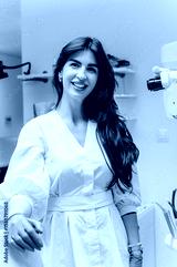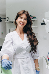 Portrait of a young female dentist in uniform at a modern dental clinic, smiling confidently.
