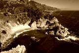 Aerial view of world famous McWay Falls at Sunset. Rare sight a waterfall that flows directly in the ocean. West Coast Big Sur USA. Pacific Ocean. Clear blue water with cliffs at golden hour