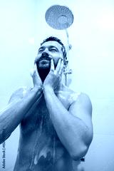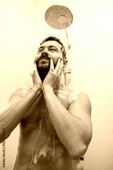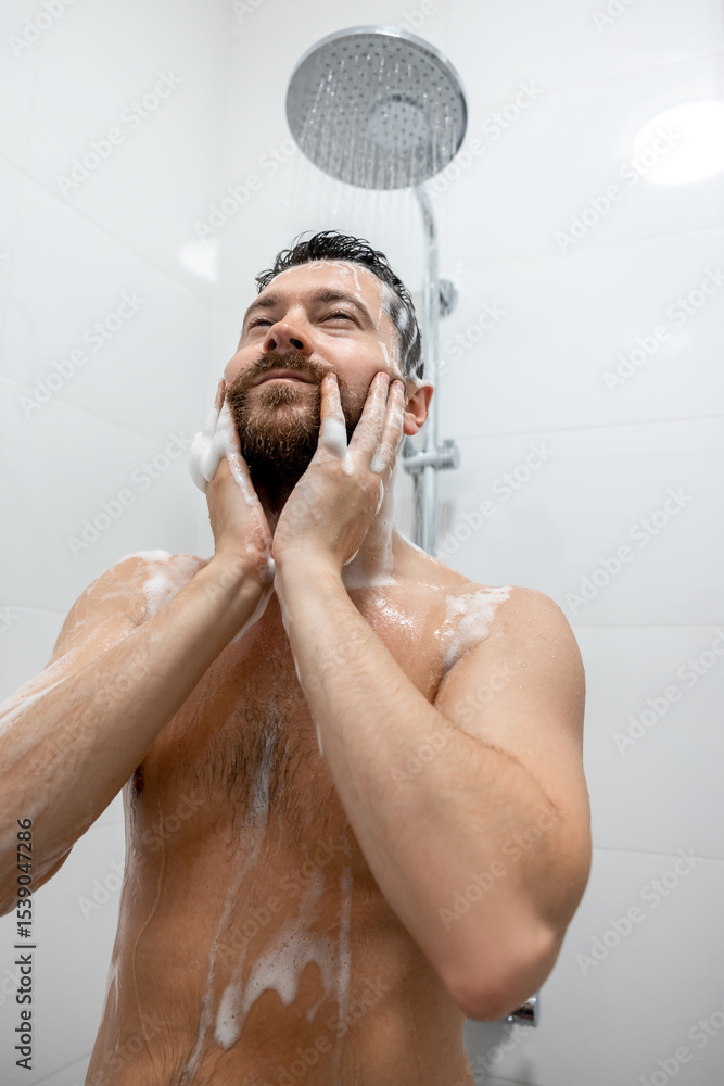 Brunette man washing head with shampoo in bathroom