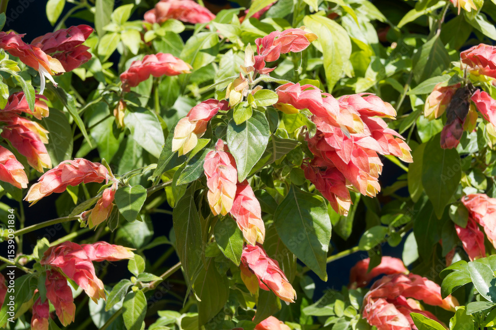 Justicia brandegeeana | Mexican shrimp plant or false hop. Small bushy shrub with clusters of creamy white leaves and white flowers in bracts turning yellow, pink to deep salmon on downy stems