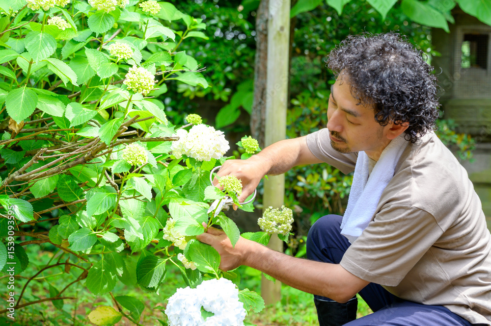 男性が白い紫陽花を手に取り花や葉の状態をじっくり観察する庭師の丁寧な作業風景