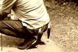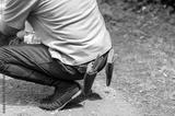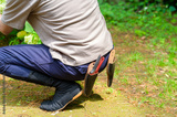 男性の腰元に道具を携えた地下足袋姿が映る作業の合間の一瞬を捉えた夏の庭師の記録カット