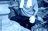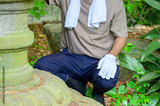 石灯籠の側で片膝を立てて休息中の男性が次の作業を見据えて静かに気持ちを整える瞬間