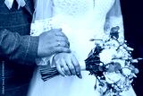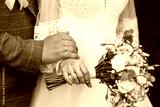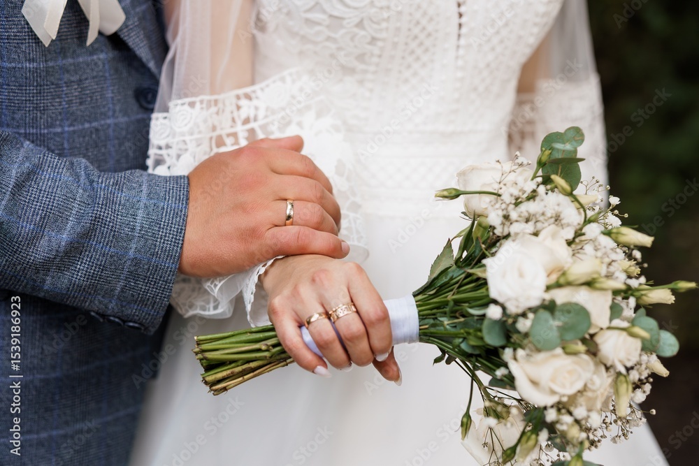 Romantic Wedding Day Close-up of Hands Holding Rings and Bouquet, Groom's Suit, White Dress, Celebrating Love, Natural Lighting, Soft Focus.
