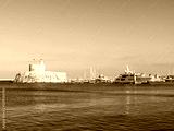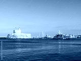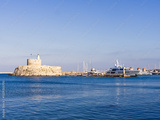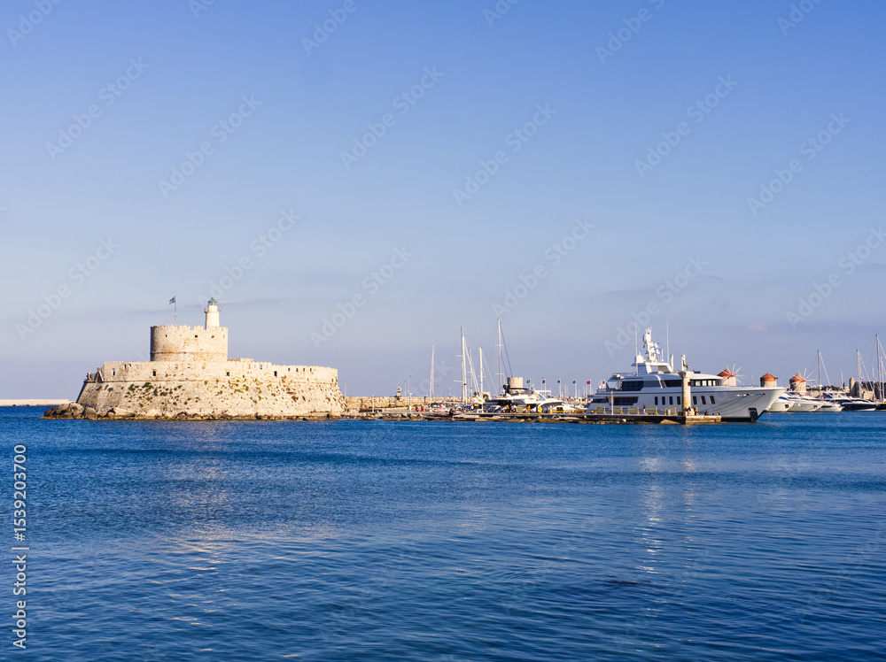 Rhodes island fortress with lighthouse and modern yachts inside the harbor with calm blue waters. Greece