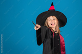 Halloween Theme. Young witch girl in mantle and black hat pointing towards the camera magic wand against blue background.