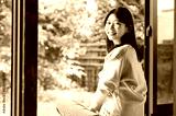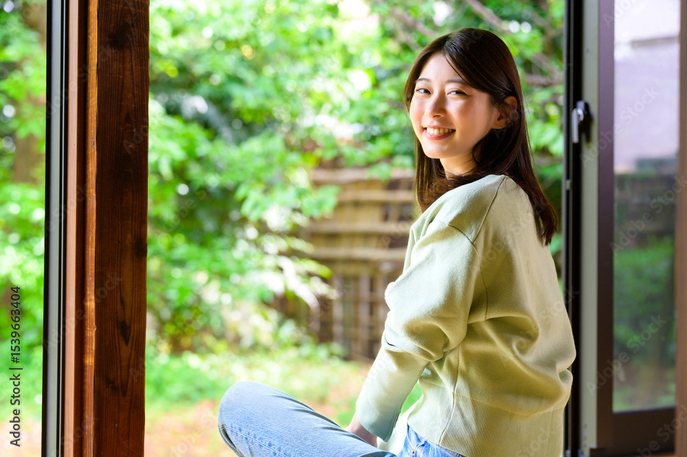 自然光あふれる縁側で女性が振り返りながら優しい笑顔を見せる夏の休日のひととき