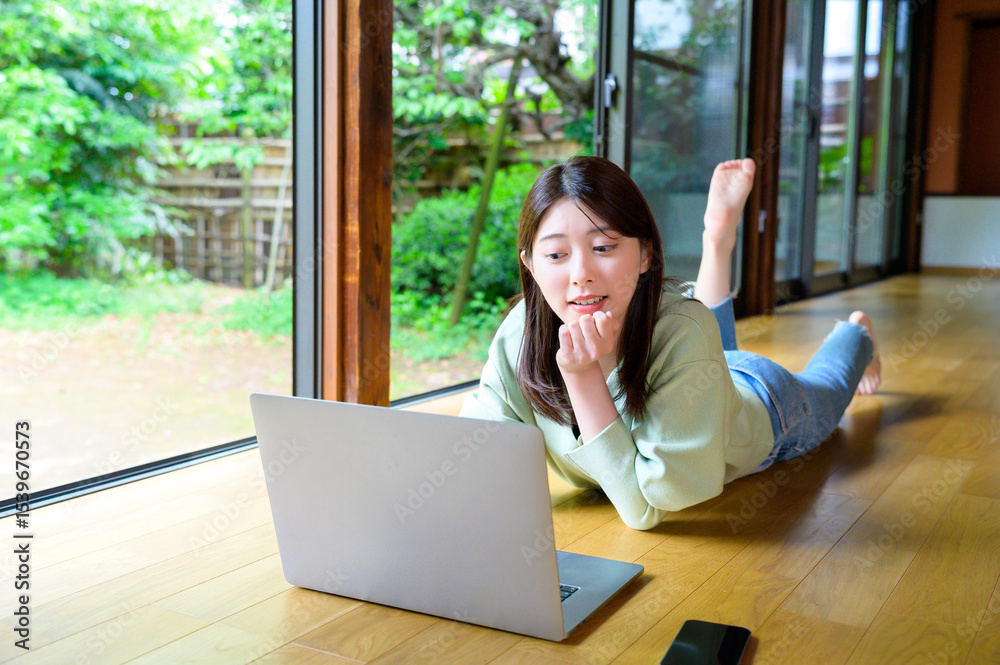 快適な空間でうつ伏せになりノートパソコンを操作する女性のリモートワークライフ