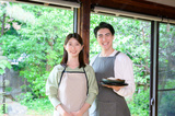 男女の料理人が並んで微笑む和風室内の爽やかなツーショットポートレート