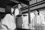 料理を手にした男性が和室で座る男女に向かって歩み寄る接客風景の一瞬