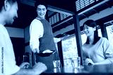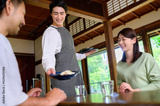 和風の室内で料理を手にした男性が2人の客に配膳する接客の様子を捉えたドキュメント風
