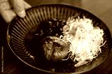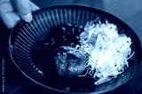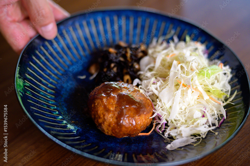 ハンバーグと千切りキャベツが丁寧に盛り付けられた和風の家庭料理のクローズアップ