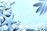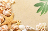 Sea shells and palm on the sand background. Summer beach.