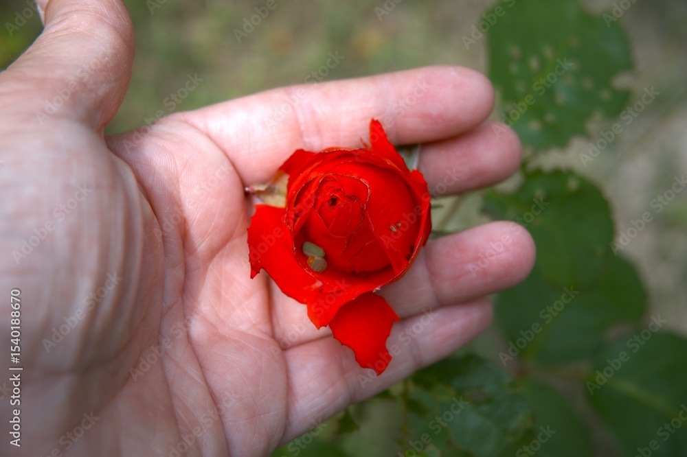 Red rose flower close up in the nature with hand and caterpillar