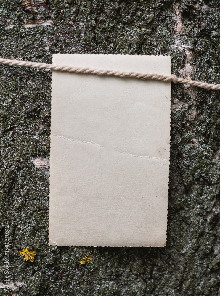 Vintage empty paper with rope on the old wooden bark texture of the tree