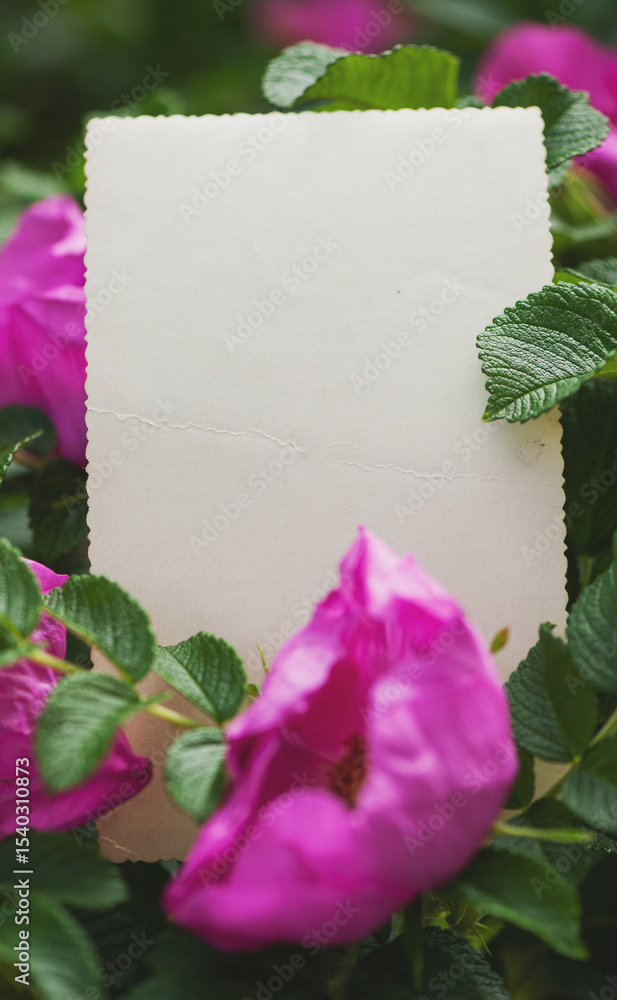 Vintage empty paper lies on green leaves of a plant with flowers, creating a rustic and natural background. The weathered sheet blends with foliage, offering an eco-friendly texture for holiday