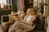 Senior Black man and senior Caucasian woman sitting together on sofa reading book, smiling and embracing, showing romantic connection and enjoying shared moment in cozy living room