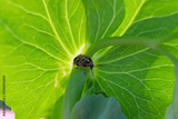 Pea seed beetle (Bruchus pisorum) adult on a pea plant.