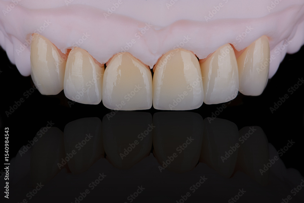 High-quality six dental crowns made of zirconium for fixation to the frontal teeth of upper jaw.