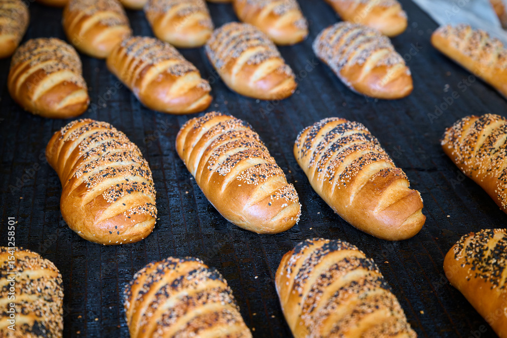 Freshly baked bread rolls emerge from the bakery oven, golden brown and steaming, ready to be served