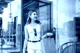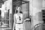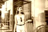 Smiling asian woman in white tank top holding shopping bag looking around as walking out of the mall